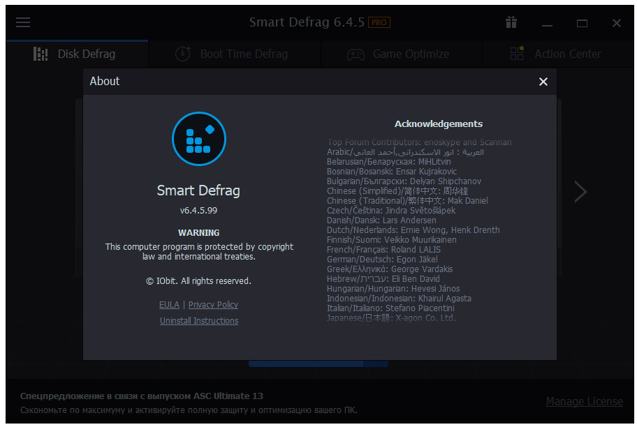 IObit SmartDefrag Pro - программа для дефрагментации жесткого диска. Работает по-принципу "установил и забыл". После установки утилита переходит в автоматический режим работы и незаметно для пользователя и производительности системы дефрагментирует файлы во время обычной работы компьютера. Таким образом, достигается высокая производительность файловой системы, так как файлы не разбиваются на фрагменты. Данная программа не только дефрагментирует файлы, но и упорядочивает их расположение относительно друг друга для более быстрого чтения.